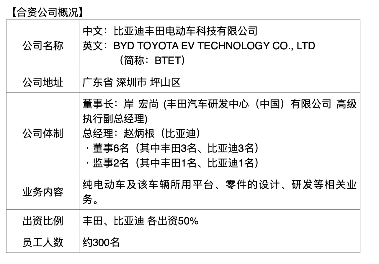 以来,两边活跃推进合资公司的筹备工作,合资公司方案于5月内正式开业。新公司的高管构成上,来自丰田的岸宏尚出任董事长,来自比亚迪的赵炳根出任总经理。岸宏尚从1月开端就任丰田轿车研制中心(我国)有限公司(TMEC)高档执行副总经理,强化丰田在我国的电动化研制。